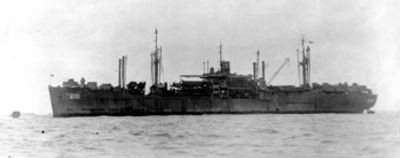 That evening, just after 1830, her task group was jumped by 10 or more kamikazes. TELFAIR and her sister-ship GOODHUE (APA-107) were attacked by three planes in rapid succession. Her gunners and those of GOODHUE combined to explode one in mid-air. A second, after ricocheting between her starboard and port kingposts, smacked into TELFAIR’s bulwark, then careened over the side. The third, his glide deflected by gunfire, crashed into GOODHUE’s cargo boom, smashed her after 20-millimeter gun tubs, and joined his compatriot in the sea.